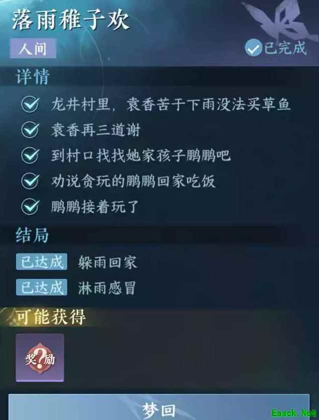 《逆水寒手游》落雨稚子欢任务攻略一、任务流程 1、下雨天!到杭州1054.1426处向NPC“袁香”提交“草鱼”并对话,获得两个“伞”