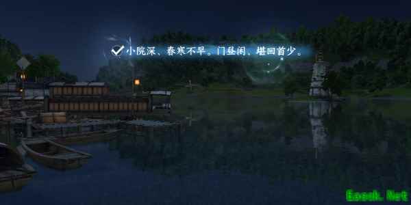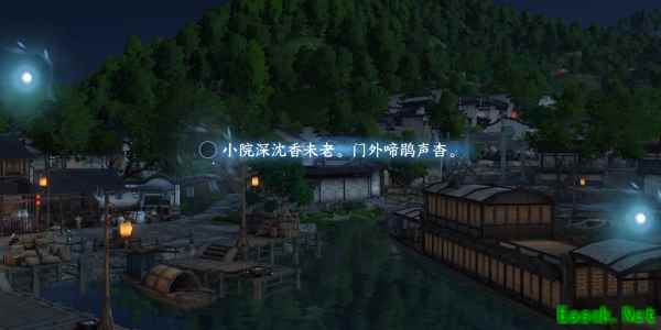 3、接着镜头转到码头,可以看见岸边房子,我们选择中间光点以小院做意象写出第二句(小院深沈香未老,门外啼鹃声杳。)。
