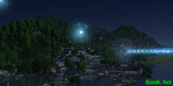 2、游戏镜头移到空中可以看见远处的山脉,我们点击右下角光点以山做意象写出一句(山城望断江天远。目送一,船愁又到。)。