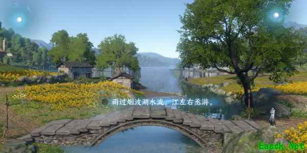 2、进入作词界面游戏镜头转到桥的侧面,我们点击中间光点以帆做意象写出第一句(雨过烟波湖水流,江左右丞游。)。