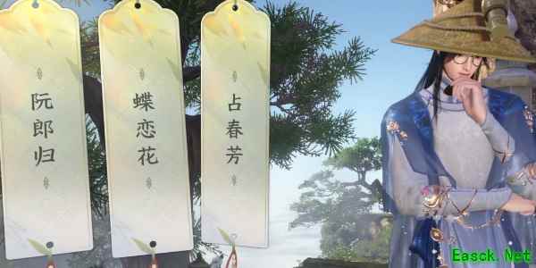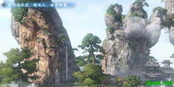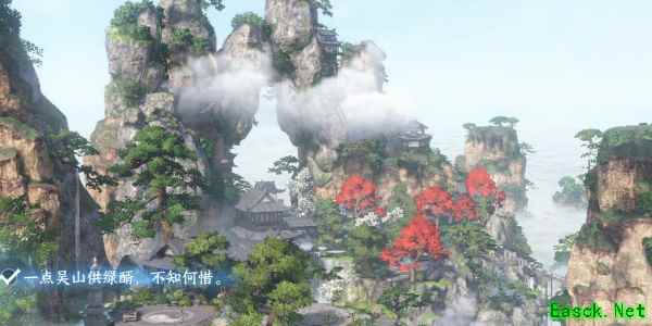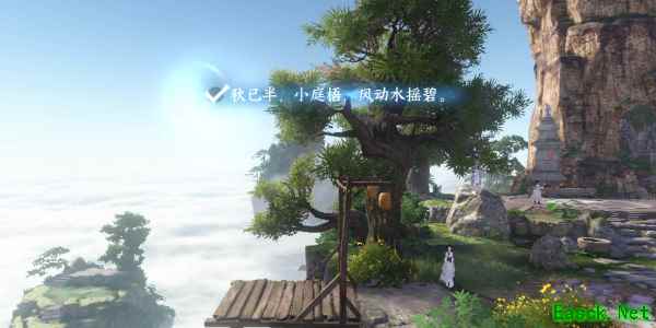 2、进入游戏中作词画面,视野移动到三清山悬崖旁树上以树为意象作词(秋水半,小庭梧,风动水摇碧。)。