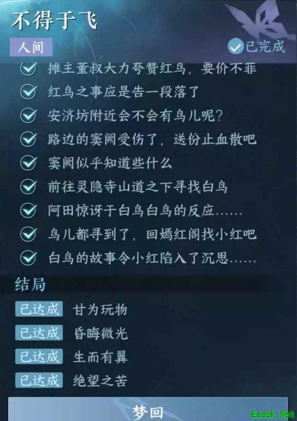 3、结局“昏晦微光”:找到红鸟时选择将红鸟带走,最后将红鸟提交给“小红” 4、结局“绝望之苦”:找到红鸟时选择等待有缘人,最后告知“小红”杂色鸟的消息 5、结局“生而有翼”:找到红鸟时选择等待有缘人,最后告知“小红”白鸟的消息 6、结局“甘为玩物”:找到红鸟时选择等待有缘人,最后告知“小红”红鸟的消息 二、任务奖励 4点剧情点,6点风云令和5个绑玉