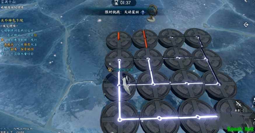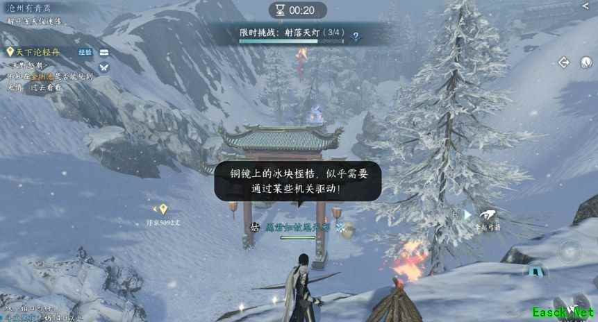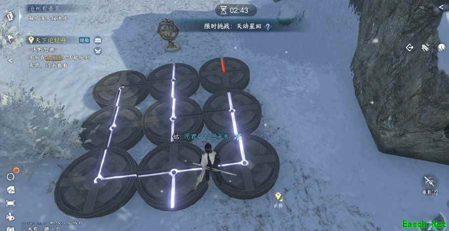 6、完成后跟随任务指引到(1082 1168)打碎乱石后自动进入山洞;密码是815,玩家记得拾取任务道具(千年冻石)。 7、玩家完成后前往(1005,1026),等待第二次暴风雪来袭,让风把你吹到后面的石头上再回到任务点,再靠近石头即可触发任务。 8、触发任务后玩家进入解密场景,用承影飞上去,先解锁浑天仪迷阵(玩家先记好大致图案),然后拿弓射孔明灯,用风吹风车。