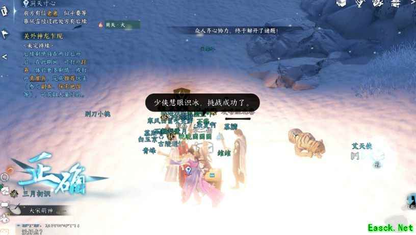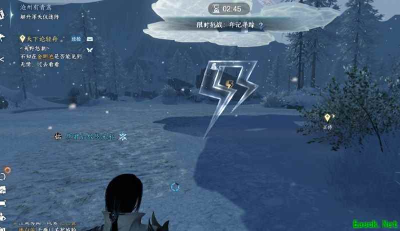 4、完成解谜后传送到特殊区域,获得霜白桐木。 5、跟随任务指引到沧州(1158,1243)。 等待暴风雪天气时与老者对话(暴风雪来袭时间在地图左上角有显示),选择“我来试试”,然后依次打碎冰块松果、松鼠、猫、狗、老虎。