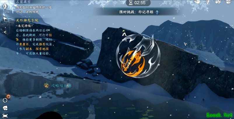 9、玩家完成解密后,打开宝箱领取江湖技能-风雪惊涛。 10、玩家需要前往(914,1056)处触发印记寻踪。 再到坐标(916,1204),进入两层的洞窟。 第一层的密码是392.,进入最里面拿到地下寒泉再去第二层 第二层的密码是302,解锁后进入最里层迎战最终BOSS雪羽雄鹰。 BOSS比较难打,注意拉扯躲技能,不要贪输出。