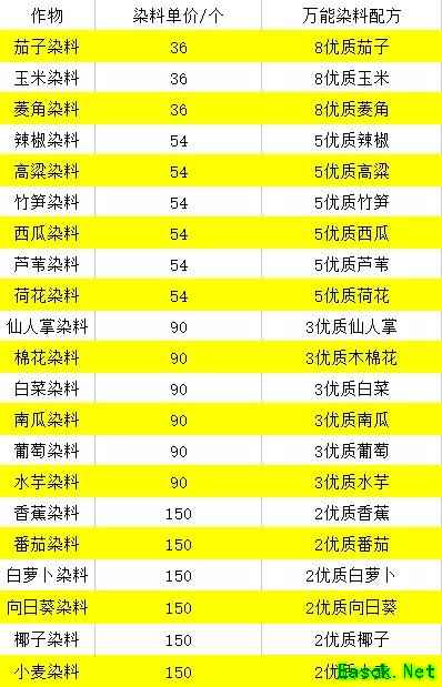 【染色剂】:以上所有普通染料都为2个蓝色作物制作,所有紫色的优质作物都可加工为【万能染料】,出售价格为270/个,只是配方所需要数量不同。