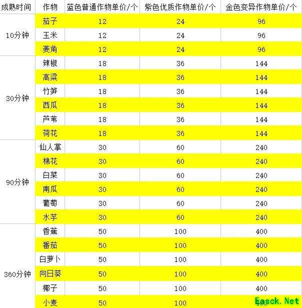 这是每种作物的成熟时间与单价,按照单价来算,如果是时间多的玩家,长期在线可以选择10分钟的作物,成熟时间快,相同时间下的产物所卖出的资材也是最多,不想那么累的可以选择360分钟的作物,时间长,直接卖价格较低,【再加工】之后价格较高,这里推荐全部种【椰子】或者【小麦】,单一作物后面再加工时也方便。