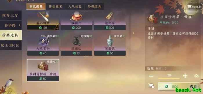 《逆水寒手游》庄园资材获取攻略一、最快方法 首先最快方式在艮岳奇珍中,每周可购买20个资材箱子,20个需要1000绑定纹玉,直接获取的16万资材,这个是算在宝箱的资源条件里面的,16万能直接达成第一个内功宝箱需要的条件,第二个则需要30万资材,可通过种植、再加工等玩法获取。