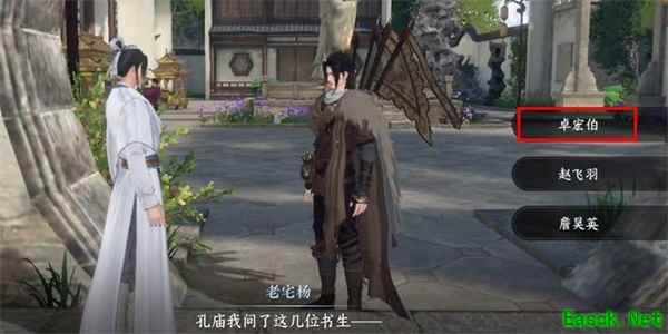 3、然后前往孔庙找到石桌旁的三位师傅对话并询问哪一位愿意收徒。