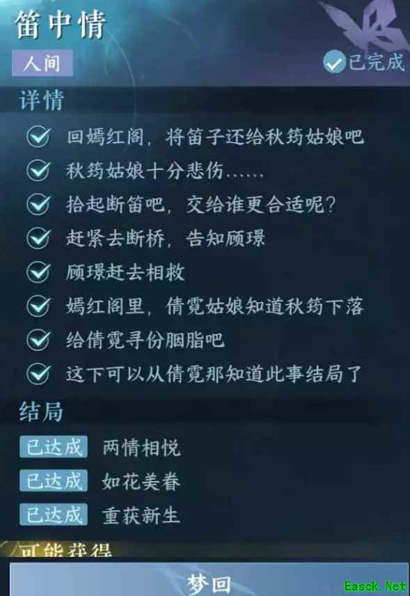 4、“如花美眷”结局线: 先到杭州1067.931处对话NPC“倪律” 之后在和“秋筠”对话时选择“他?他是谁?” 拾取“断笛”后选择“拾起来交给倪律”