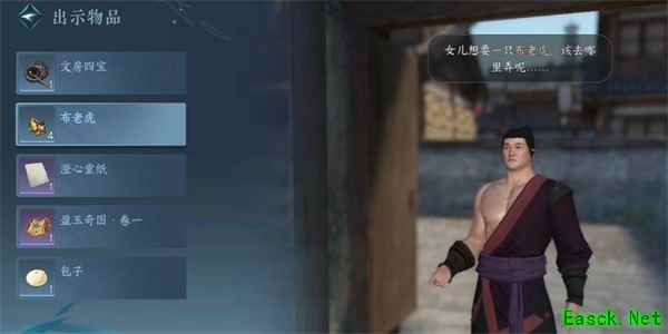 3、接着玩家找到汪屠户,此时继续对话,并得知她女儿需要布老虎,之后玩家需要将布老虎给他,接着继续对话,对话结束即可完成此任务。