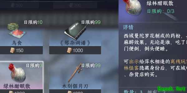 5、随后玩家需要在杂货铺购买3个绿林酣眠散,之后即可贩卖玩家了。