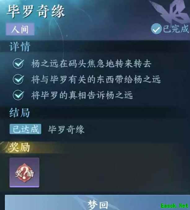 3、向“杨之远”提交“胡饼·良”并对话即可完成任务 如果前面两步都完成了,传闻解锁了但是没有npc,重新进入游戏或者重新进入地图均可 二、任务奖励 3点剧情点,2点风云令和2个绑玉