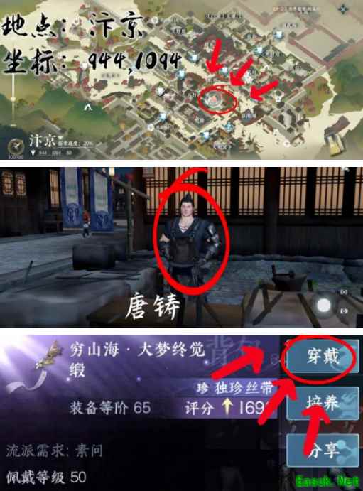 位置四:汴京【944,1094】 回到“唐铸”处提交“穷山海兵甲” 获得“穷山海·大梦终觉缎”并穿戴。