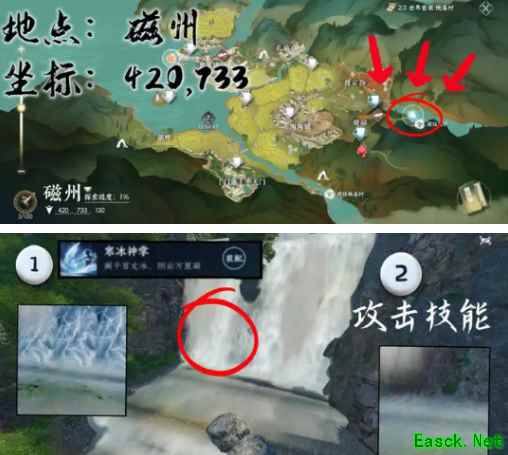 -磁州【420,733】 1、玩家先使用江湖技能“寒冰神掌”冻住瀑布,再用普通攻击技能打碎;