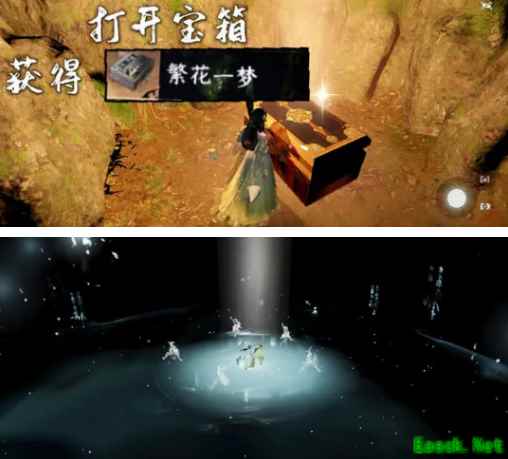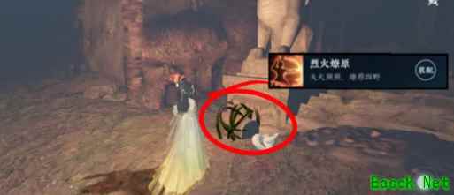 2、之后进入山洞找到被草缠着的宝箱,使用江湖技能“烈火燎原”烧掉草。