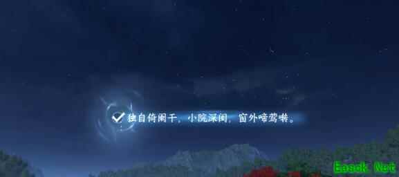 4、玩家随着镜头移动意象作出下一句独自倚阑干,小院深闺,窗外啼应啭即可完成任务。