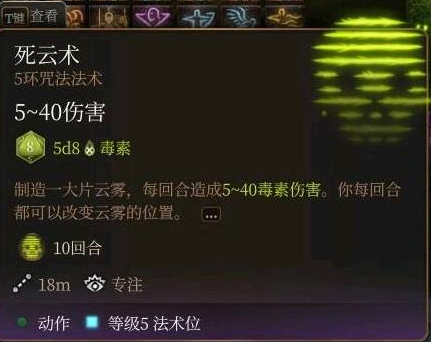 死云术:20尺半径毒雾,每回合造成5d8毒素伤害并提供遮蔽,适合对抗远程敌人。