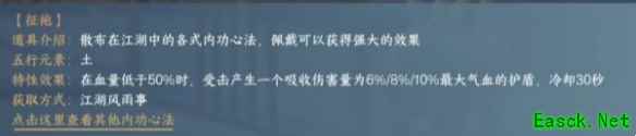 二、道具介绍 1、作用:角色血量少于一半时,将会获得一个护盾,冷却时间是三十秒。 2、五行元素:土。 3、类型:属于内功心法。