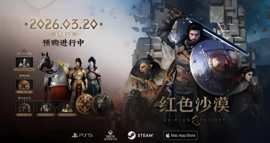 红色沙漠这款制作出色的大型开放世界RPG游戏在经过几次跳票后终于确定了上线时间,游戏模式也从网游转为了单机游戏。其开放世界的自由度以及战斗的优秀手感使它拥有极高的热度。那么下面一起看看游戏的发售时间吧。 发售时间 2026年3月20日正式登陆PlayStation 5、Xbox Series X|S、Steam平台 游戏预购 预购目前已经在各大平台全面开启,预购奖励如下: 「卡尔莱德盾牌」 PS5版本额外奖励「格罗特班特板金套组」 游戏介绍 游戏以名为“帕卫尔”的广阔大陆为背景,该大陆因一场涉及史无前例的庞大力量而陷入战争阴影,玩家将扮演佣兵领袖克里夫,集结分散的同伴共同对抗威胁世界的邪恶力量。 |