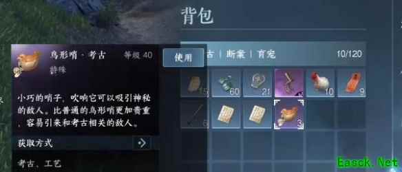 4、打开背包,在身份-考古-断案-育宠中可以看到鸟形哨。