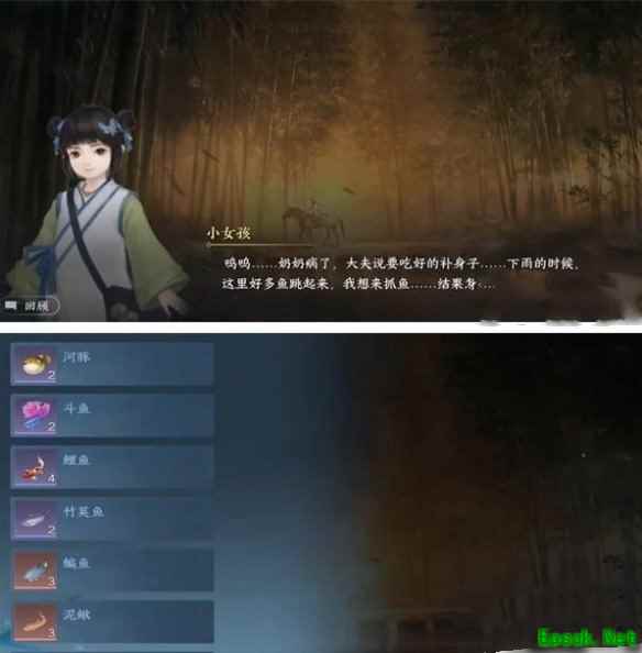 3、与小女子进行对话交谈,把小女子需求的鱼出示给她。
