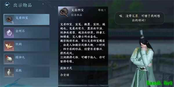2、接着玩家需要去杂货铺购买文房四宝,之后找到宋乐词并出示给他并对话。