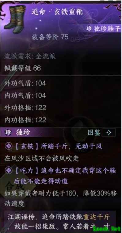 二、属性介绍 1、品质:独珍。 2、有利于玩家在风沙区域行走,如果玩家的耐力值小于160,移速将会降低30%。