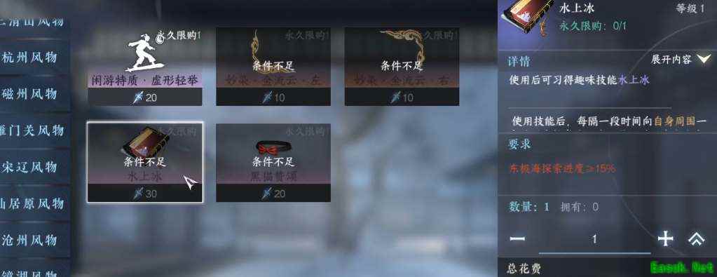 《逆水寒手游》水上冰技能获取攻略1、在游戏中打开菜单,选择【开放世界】,然后点击界面右上角的【商店】 2、打开东极海的风物商店,这里使用30个白刃飞霜就可以兑换江湖技能-水上冰了。