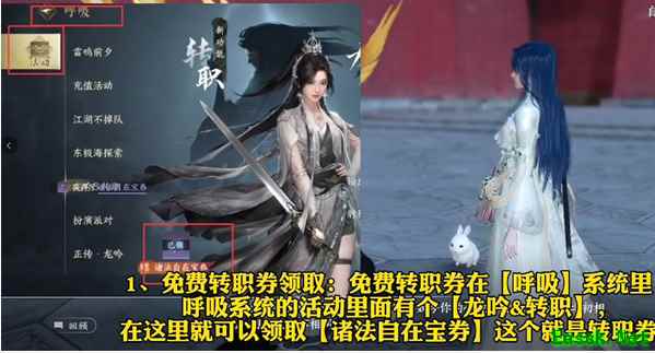 逆水寒手游免费转职券怎么获取一、获取方法 1、玩家需要参加龙吟转职活动,参与即可获得免费转职券。 2、首先登录游戏后点击呼吸系统,之后点击活动中的“龙吟转职”。 3、进入后领取“诸法自在宝券”,这个就是免费转职券。