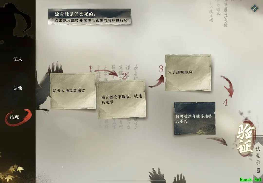 《逆水寒手游》偷梁换柱断案攻略1、首先去磁州驿站听旁人说话,然后打开线索簿推理事情的经过。纸片点击可翻转,正确顺序如下: