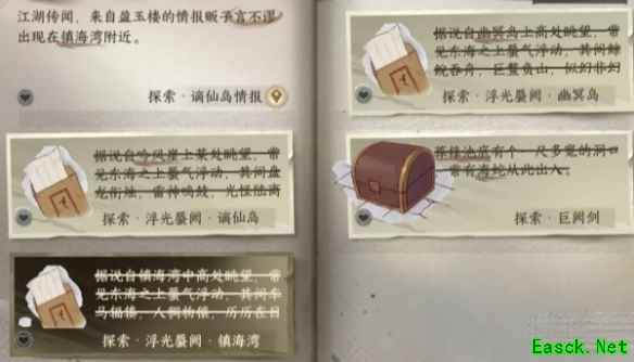 3、镇海湾:(716,196),需要完成引雷破石,才能完成对应的传闻。 4、幽冥雾海:需要前往(1748,241),完成对应的鸣雷之花。 5、全部完成之后,玩家可获得一个金宝箱奖励。 以上就是小编整理带来的《逆水寒手游》浮光蜃阙探索攻略,更多相关游戏攻略,请关注手游网! 本文内容来源于互联网,如有侵权请联系删除。 |