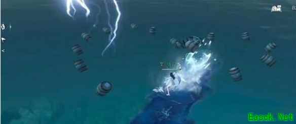 3、之后使用寒冰掌在水中结冰,一边结冰一边往前走。 4、到达如图水桶的位置即可使用寒冰掌破坏水桶。