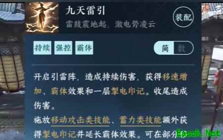 技能介绍: 可以给玩家提供移动速度以及霸体效果,并且提供一层掣电印记,可以召唤天雷,造成伤害,还可以对玩家附加眩晕,是一个好用的pvp技能。