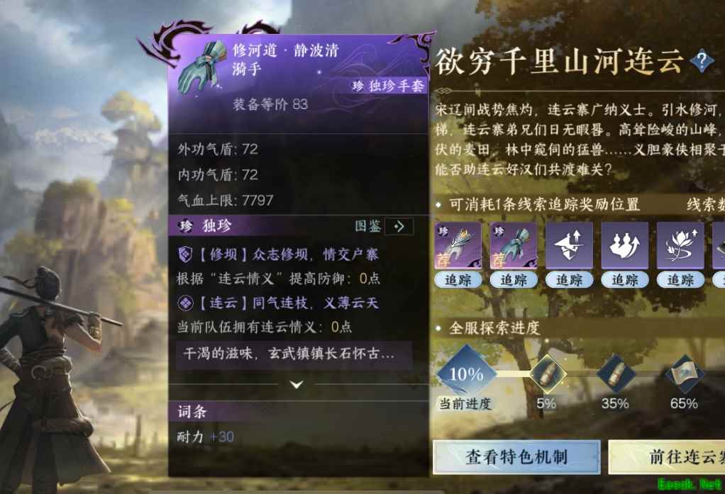 【修河道·静波清漪手】 装备说明:83等阶全流派独珍手套 穿戴等级:65级 独珍效果:【修坝】队伍中每有1点“连云情义”,此装备获得50点防御(最多500点) 【连云】同气连枝,义薄云天为全队提供1点“连云情义” 以上就是小编整理带来的《逆水寒手游》何方问渠探索任务攻略分享,更多精彩内容,请点击关注手游网,小编将持续为您更新! 本文内容来源于互联网,如有侵权请联系删除。 |