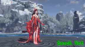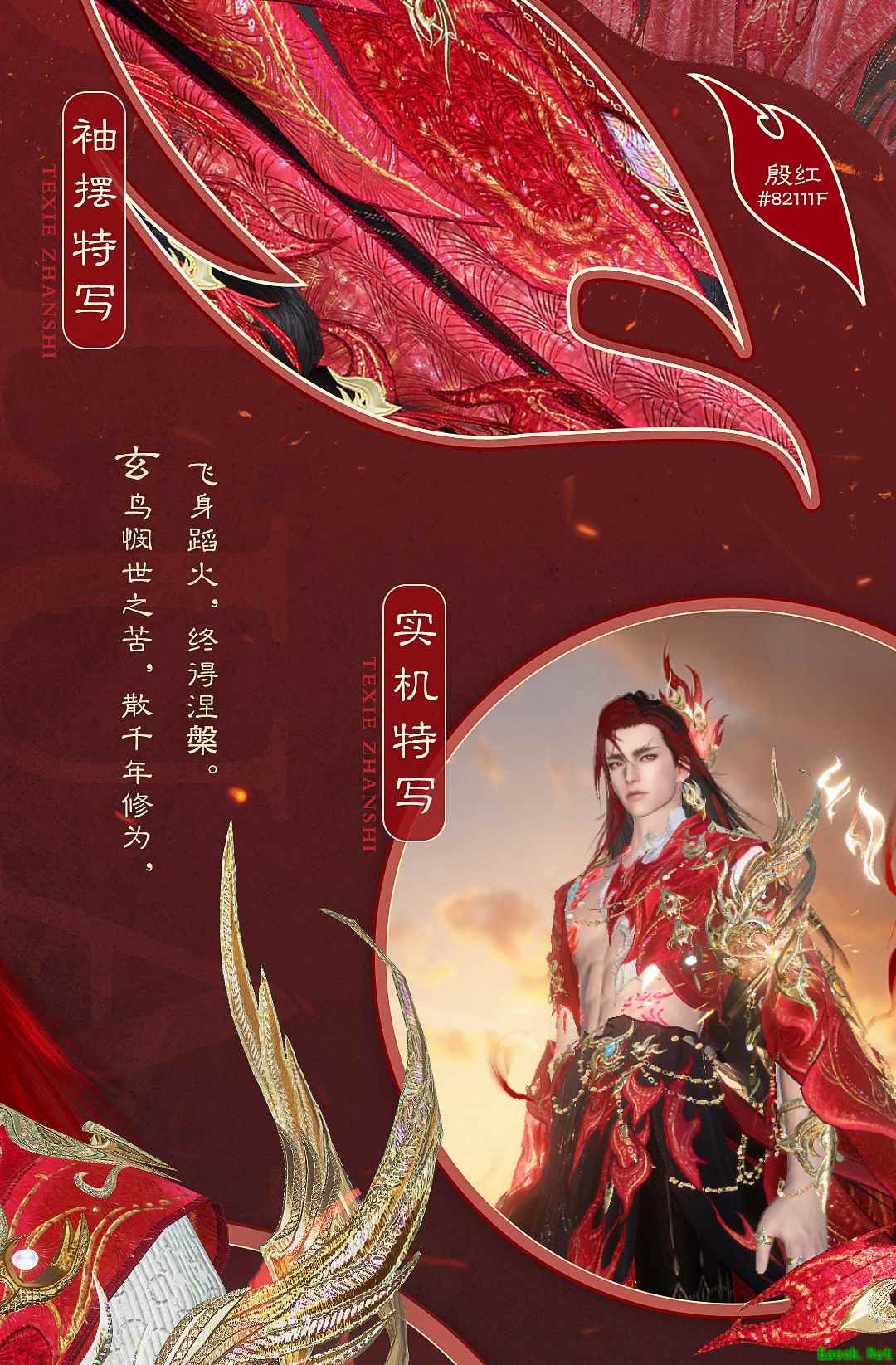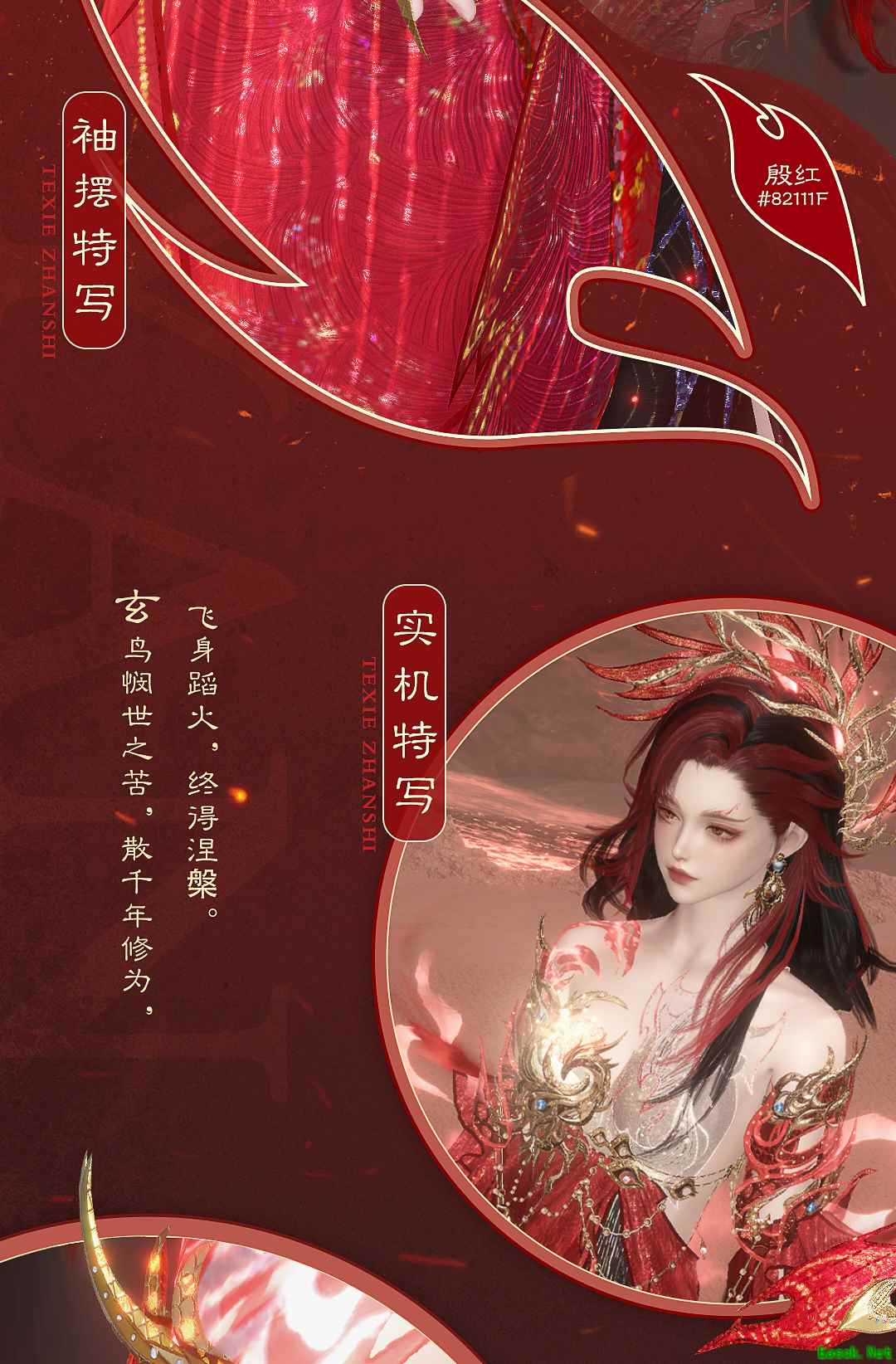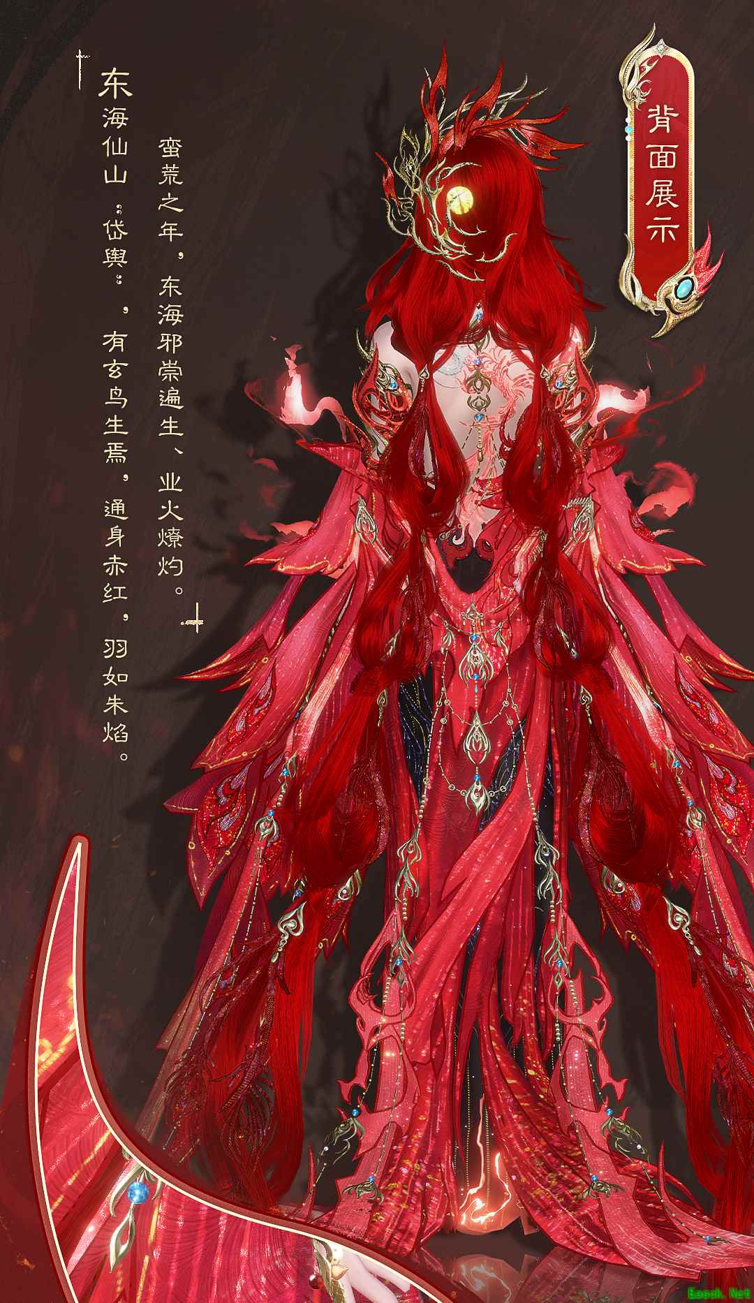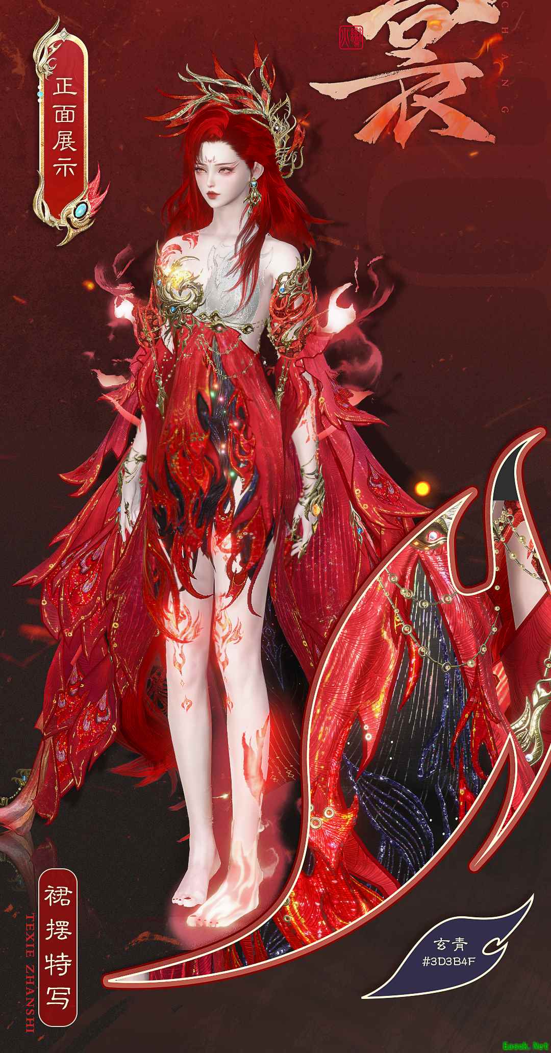 女款时装【朱焰羽裳】,用灼灼赤焰描绘出玄鸟真身,通体赤色,仿佛燎原之火;羽翼与裙摆融合,又有飞天之姿。真火之力化为花纹盘旋于裸露的皮肤之上,时隐时现仿若星火;黑红相见的发色之上,幻化出代表玄鸟的羽翼冠冕,更是美不胜收。