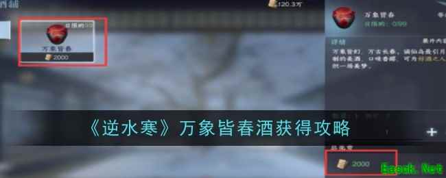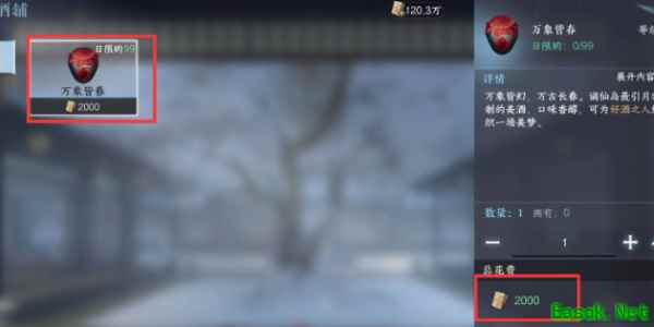 3、进入酒铺,使用2000交子即可购买万象皆春酒。 注:万象皆春酒可用来完成东极海的人间任务万象皆幻。