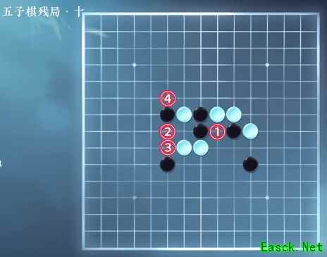 逆水寒手游五子棋残局十攻略1、神秘残局 五子棋残局十我们要面对的是隐士高人,具体解法如下: 最近汴京六扇门附近出现了一位隐士高人,自称五子棋罕有敌手。快前往挑战他留下的残局,让路人见识见识神来一手!