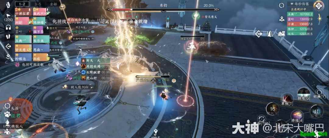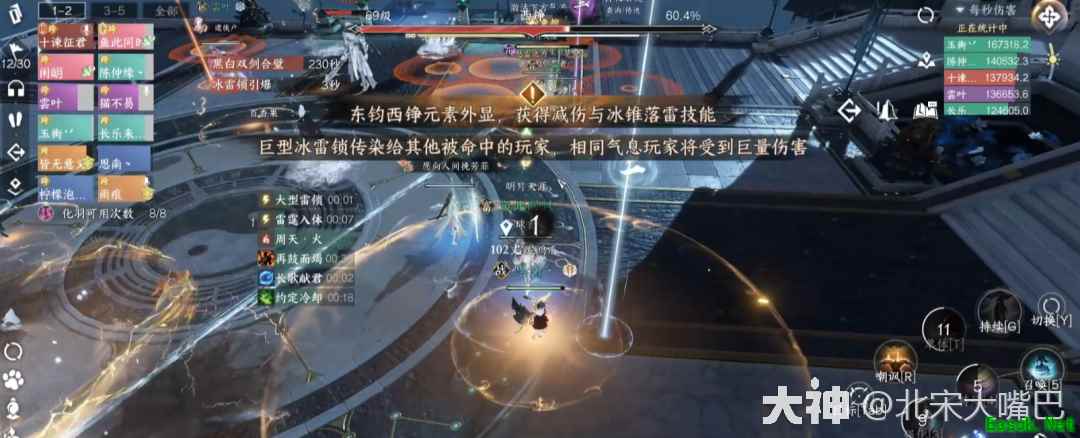 新增机制3: BOSS获得高额减伤,尤其是西铮减伤效果更高,需要拾取冰雷之力(就是1~6标点处)对其破盾。 应对方法:脚底黄圈的2个输出去拾取3&6号点的冰雷之力,脚底白圈的4个输出去拾取1,2,4,5号点的冰雷之力,拾取后可获得破盾效果,消除BOSS减伤机制。 1)站在冰雷之力处充能到100%即可拾取获得 2)如果白圈有输出在帮忙传毒,攻击完BOSS4次以后冰雷之力消失,需要一个输出第二次去拾取冰雷之力,快速破盾BOSS。