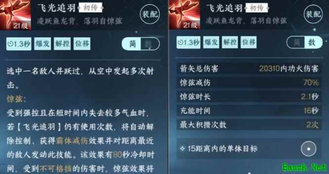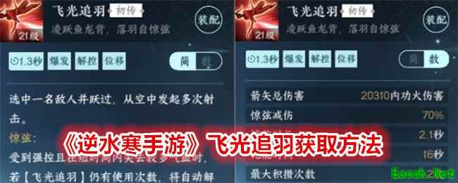 《逆水寒手游》飞光追羽获取方法新增百家技能【飞光追羽】: 选中一名敌人并跃过,从空中发起多次射击。 每隔一段时间受控状态下短时间失去大量气血时可自动解控并发动。英雄·谪仙惊涛首通奖励获取。 首通英雄流派试炼获取
