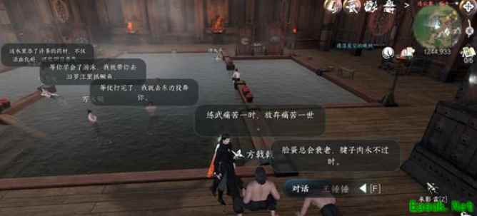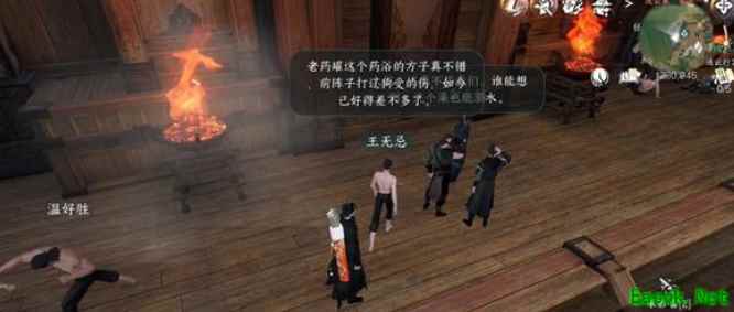 2.到连云寨澡堂1282.940处白大娘对话。 3.再次找到王无忌并对话(王无忌会四处走动,他停下来以后就能对话了)。 4.到连云寨澡堂1256.954处孙煜对话。 5.到连云寨澡堂1244.933处方戟对话。 6.最后返回白大娘处对话即可,几个选项分别对应不同结局,自行选择即可。