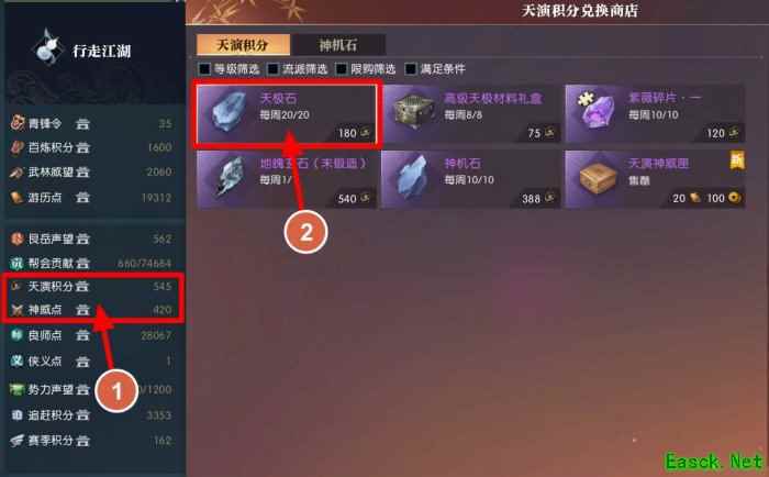 2.、天演积分&神威点兑换 每周可通过天演积分&神威点兑换商店(共上限)兑换20个,需消耗3600点天演积分&2400神威点(共上限),最高可获得1000点剑魄。