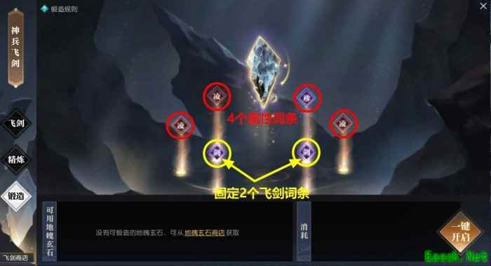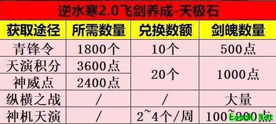 养成道具 养成飞剑所需的道具为天极石,每个天极石可获得50点剑意,若剑意上限则转换为剑魄。每周剑魄获取上限为3500点。