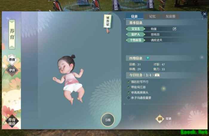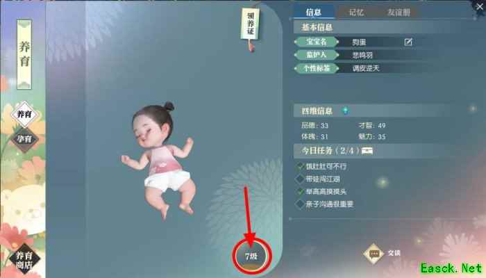 ③每日互动任务:点击右下角的【子女】按钮,快捷键是Ctrl+E,在信息界面可看到对应任务。 任务很简单,按照任务流程来,比如【饿肚子可不行】就是与宝宝互动,点击【喂养】,完成每个任务可获得25点成长值。