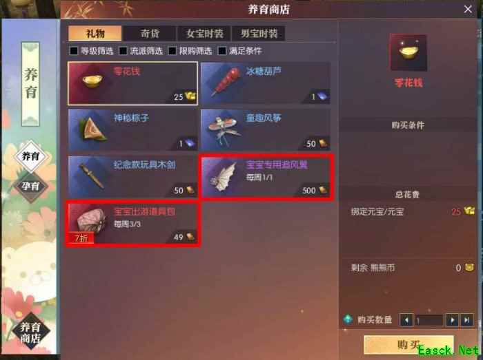③出游时可在养育商店中花费49点游历点兑换宝宝出游道具包,打开后可随机获得出游道具。