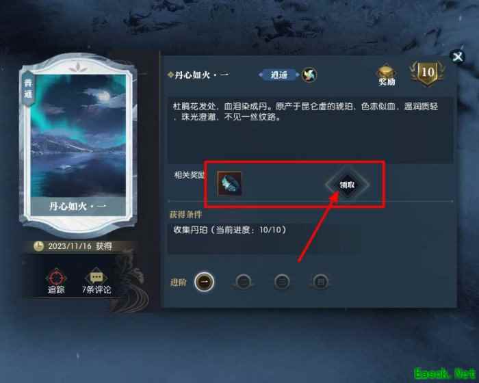 集齐10个丹魄可获得说英雄卡【丹心如火·一】,领取奖励即可获得该装备。