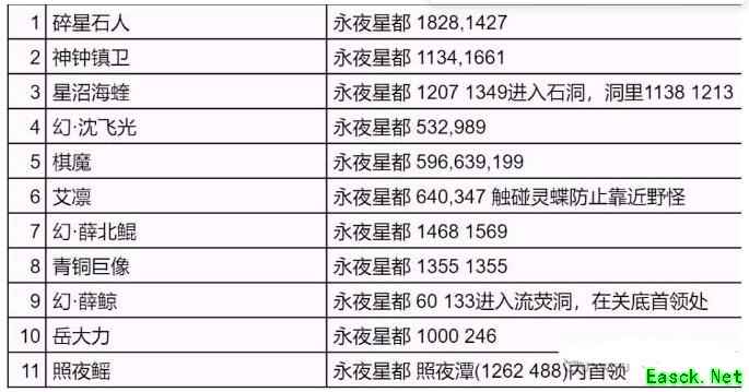 《逆水寒手游》永夜星都野外强敌位置大全永夜星都野外强敌位置: 1、碎星石人:永夜星都(1828,1427) 2、神钟镇卫:永夜星都(1134,1661) 3、星沼海蝰:永夜星都(1207,1349)进入石洞,洞里(1138,1213) 4、幻沈飞光:永夜星都(532,989) 5、棋魔:永夜星都(596,639,199) 6、艾凛:永夜星都(640,347)触碰灵蝶防止靠近野怪 7、幻薛北鲲:永夜星都(1468,1569) 8、青铜巨像:永夜星都(1355,1355) 9、幻薛鲸:永夜星都(60,133)进入流荧洞,在关底首领处 10、岳大力:永夜星都(1000,246) 11、照夜鳐:永夜星都(照夜潭(1262,488)内首领