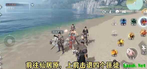 4、战斗结束后对话白衣男子,给他抓螃蟹,然后前往莲花楼,在仙居原地图上右上角,坐标是918.134附近。