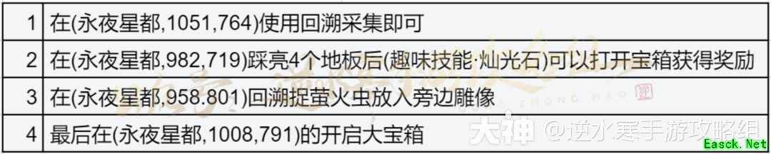 《逆水寒手游》背水饮刀特质获取方法背水饮刀·特质 1、在(永夜星都,1051,764)使用回溯采集即可 2、在(永夜星都,982,719)踩亮4个地板后(趣味技能灿光石)可以打开宝箱获得奖励 3、在(永夜星都,,958.801 )回溯捉萤火虫放入旁边雕像 4、最后在(永夜星都,1008,791)的开启大宝箱
