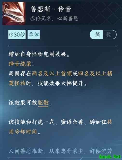 1、心境赤伶收集完线索,和无情讨论时出示门锁。 2、回答"卫签书是何时死亡的"时,北巷是选的的薛无净和发现尸身的时间。 3、后面跟简由对话时出示门锁。 4、与无情讨论案情时,选择“还不好说”可以给无情好感度。 5、跟随简由时,保持距离在4丈以外;出示证物-短刀;第一日剧情结束。 6、第二日跟着指引一直做就好了,做完后领取善恶断恶伶音。 7、善恶断伶音技能效果:百家技能中的善恶断右上角选择更换为善恶断·伶音,提供4%+596点首领克制,持续24秒,冷却30秒。多怪场景效果提升25%。 8、搭配建议:技能效果与姬蜜儿/打虎一式/醉如狂共CD,可与群侠-辉雪寒瑛一起搭配。除九灵外,其他职业可替换掉原来的打虎一式。 以上就是小编整理带来的《逆水寒手游》善恶断伶音获取方法,更多精彩内容,请点击关注手游网更新! 本文内容来源于互联网,如有侵权请联系删除。 |